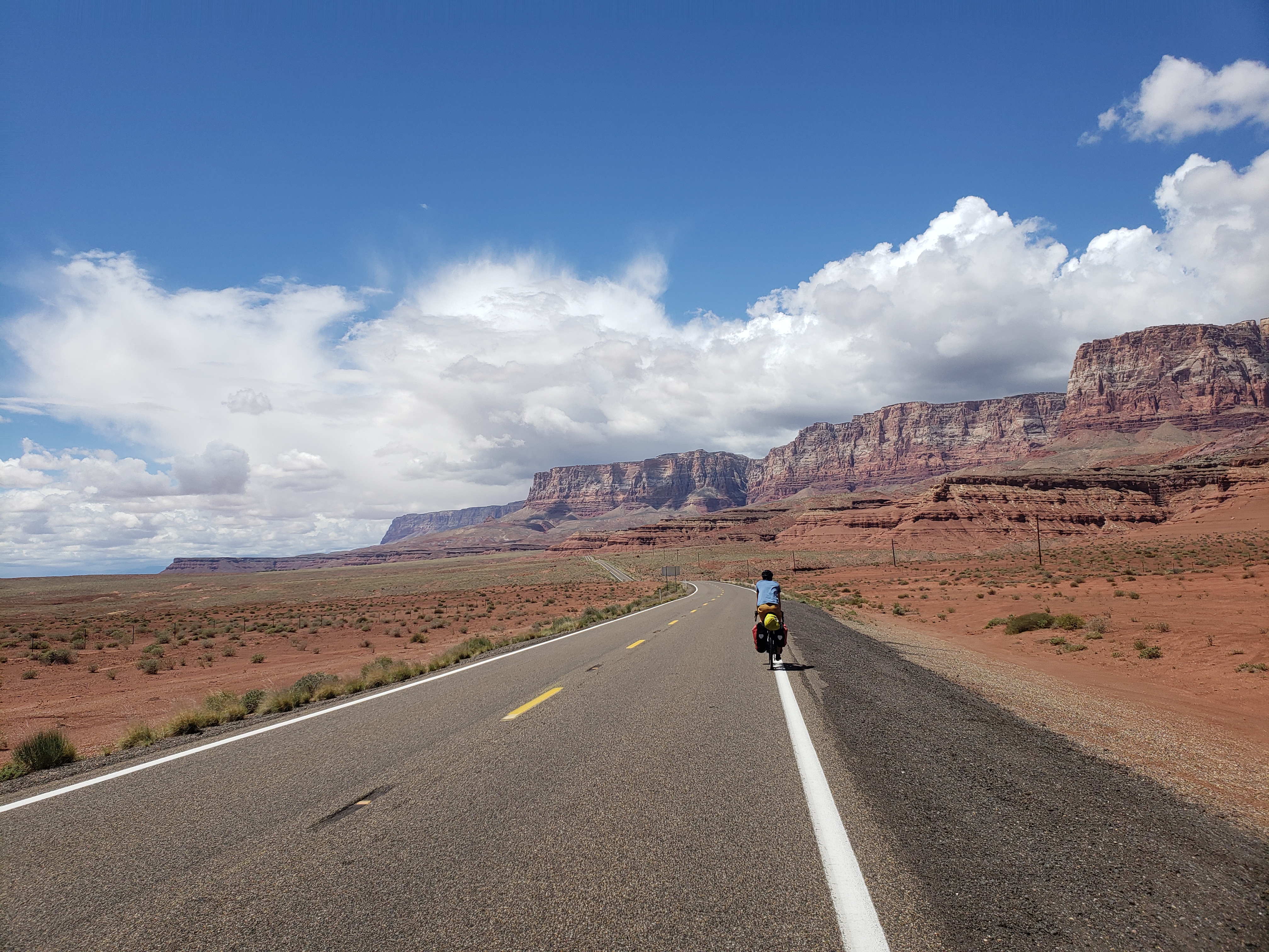 To the south, where we had come from, the sky was filled with dark clouds and rain as far as the eye could see. To the north were fluffy clouds and blue sky – we were right on the edge of the storm. After twenty minutes or thirty of waiting, the rain finally began to lighten up and we escaped the storm. The final thirty miles were much easier as we had gotten most of the climbing out of the way in the morning. We crossed the Colorado River and found a room in the lodge at Marble Canyon right as another rain storm approached.