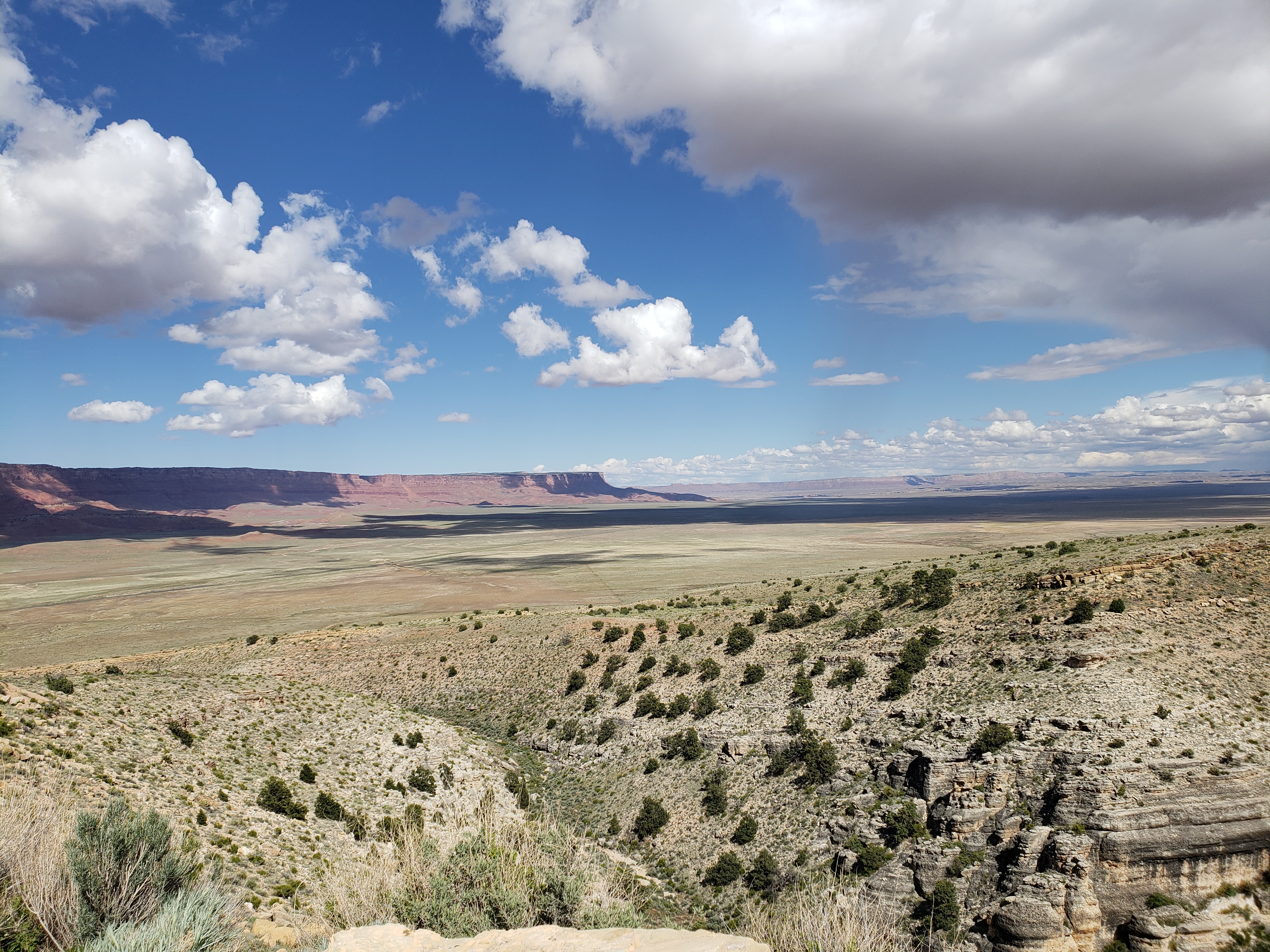 Below us, the grand Northern Arizona landscape revealed itself. To the west was the high plateau holding the south rim of the Grand Canyon, with sharp cliffs dropping off its east side. To the east shorter cliffs and mesas lined the horizon, and our road led us straight between the two, seemingly endlessly into the desert.